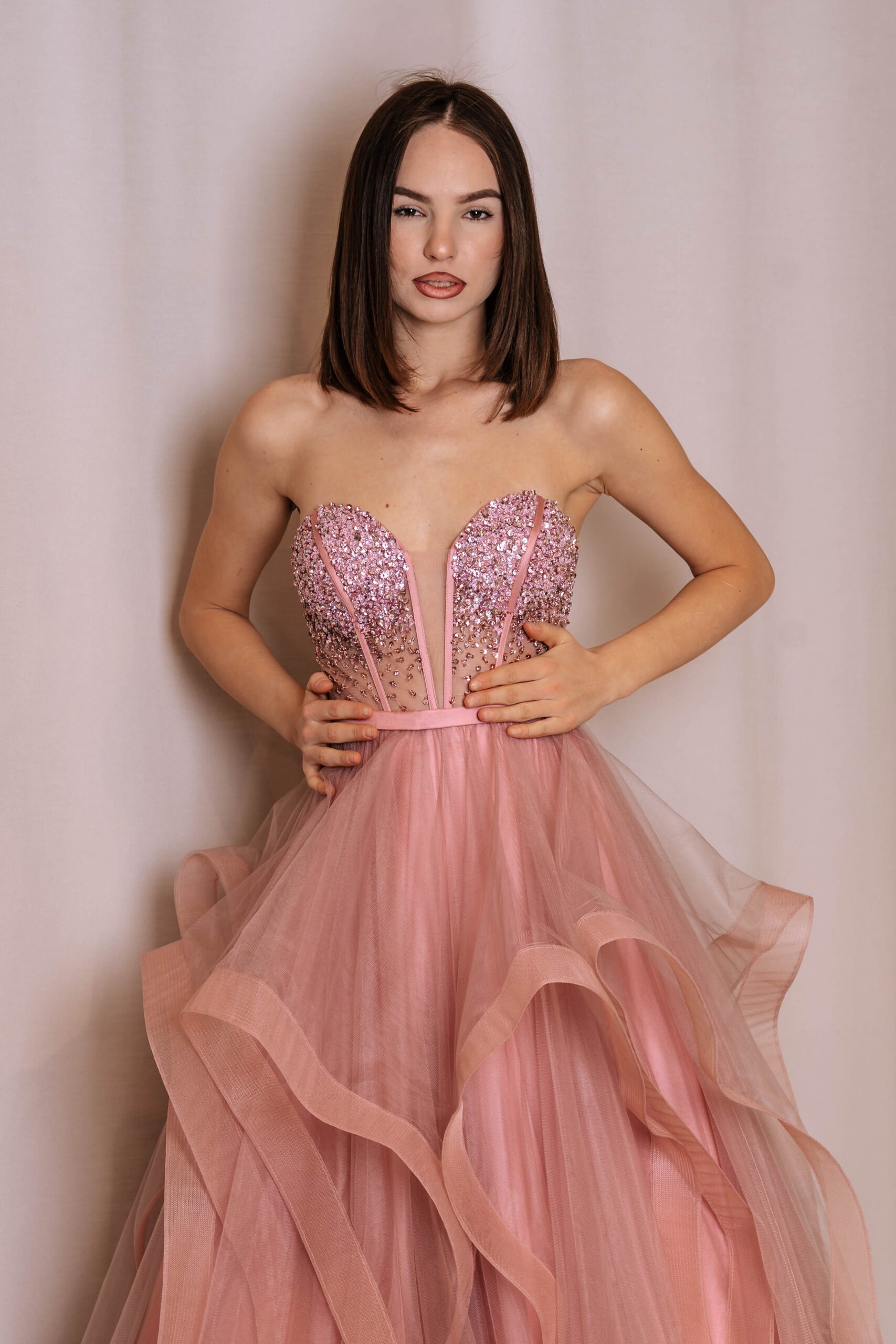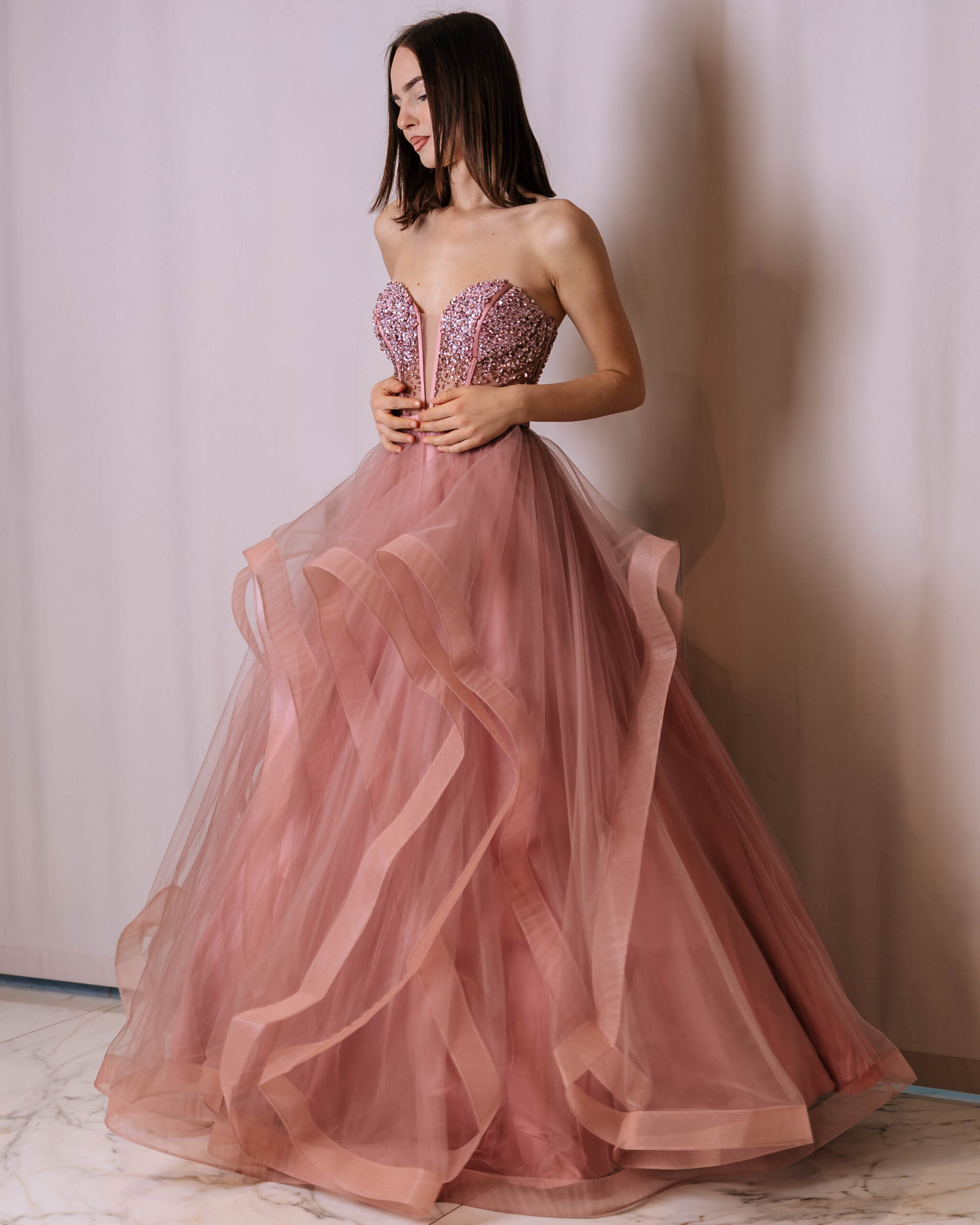 Il corpetto decorato valorizza la figura, mentre la gonna ampia in tulle crea un effetto scenografico e leggero.