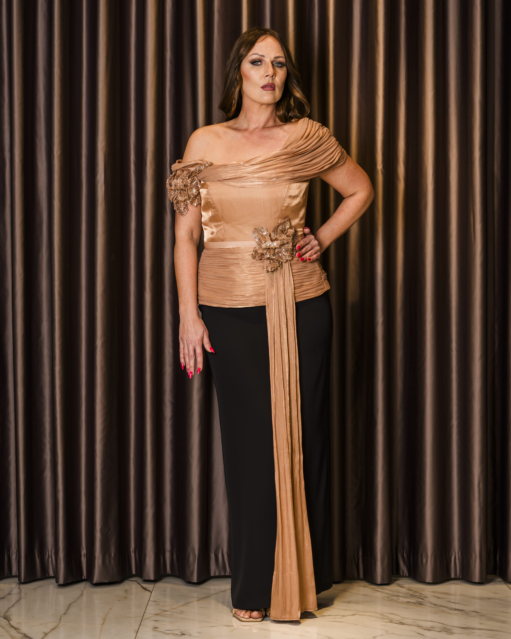 Bronze Harmony è un abito che esprime eleganza e raffinatezza attraverso linee armoniose e dettagli ricercati.