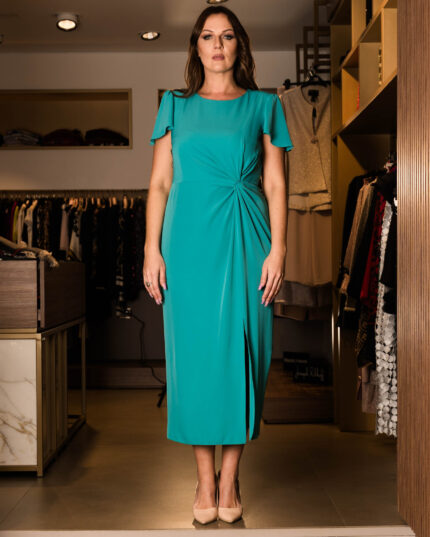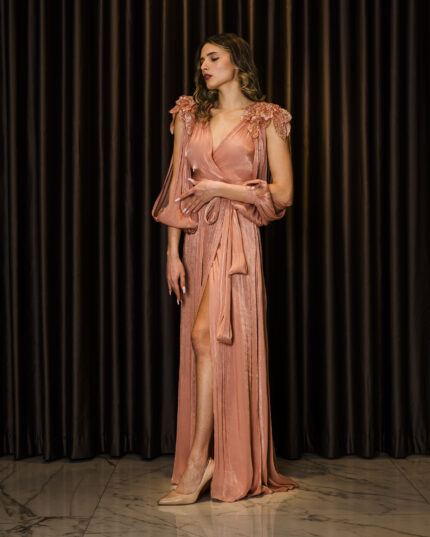 Il drappeggio strategico scolpisce la figura valorizzando il punto vita, mentre lo spacco dona movimento e sensualità.