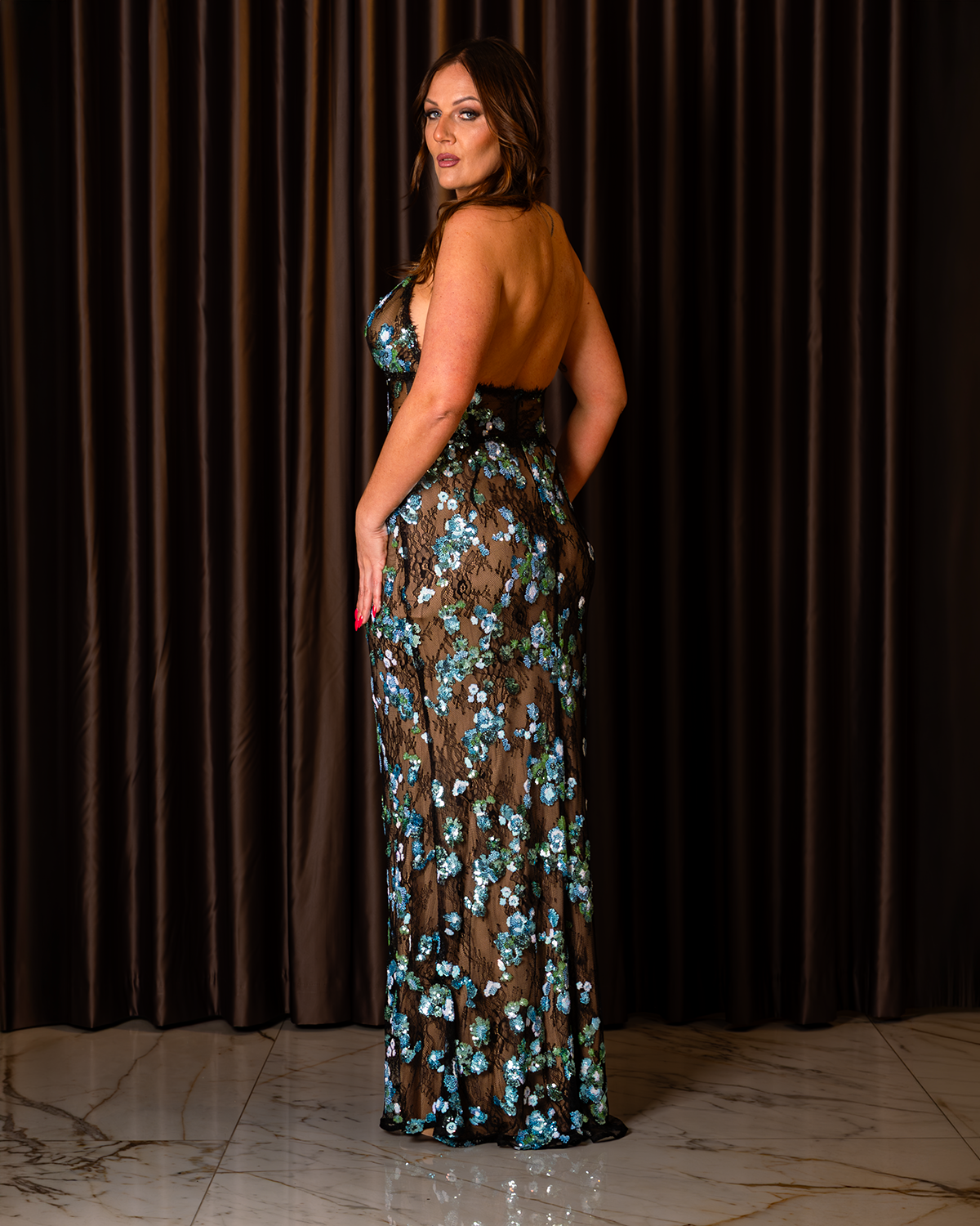 Un abito che unisce fascino e delicatezza attraverso il contrasto tra il pizzo nero e i ricami floreali nei toni dell’azzurro.