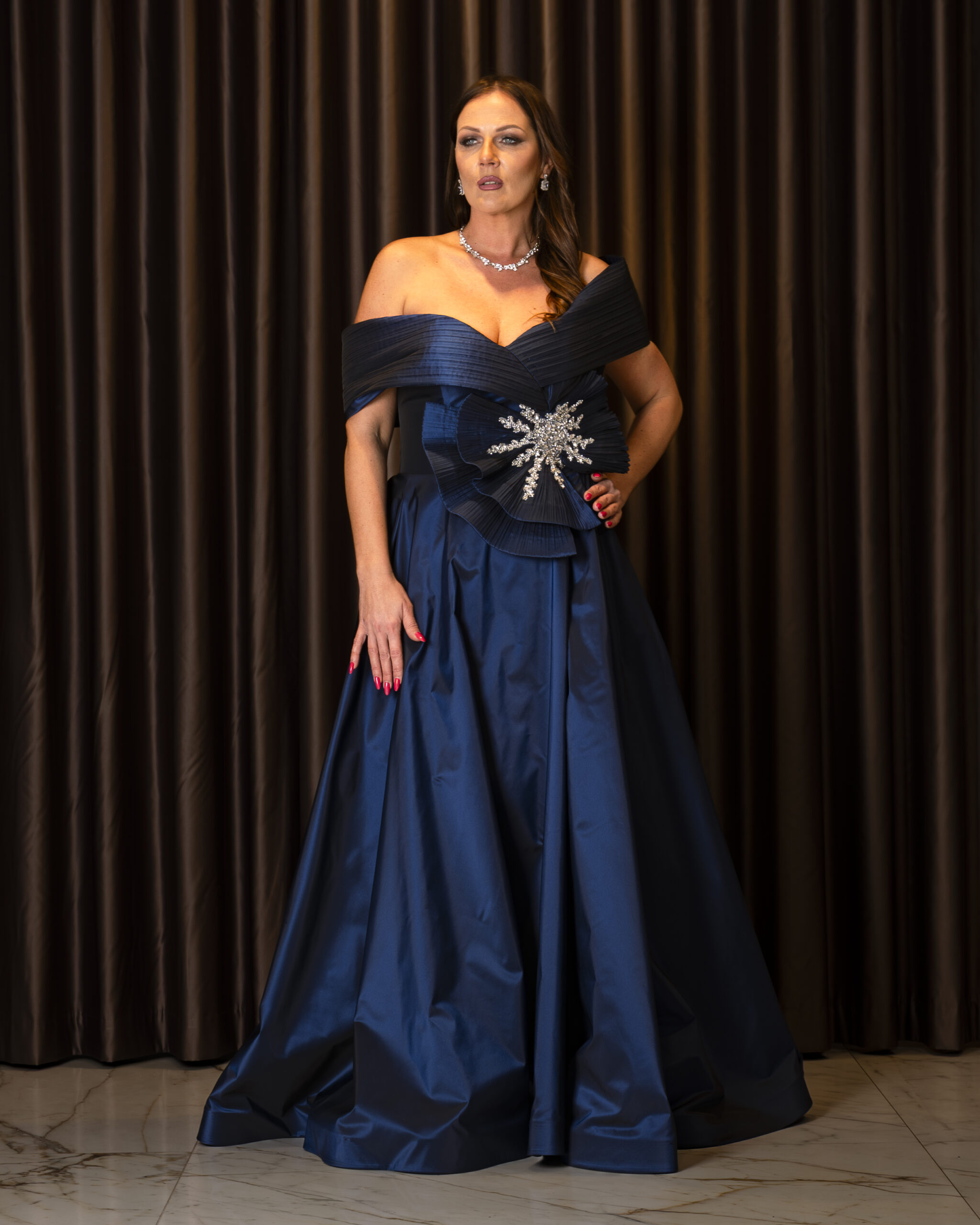 La struttura importante e lo scollo off-shoulder esaltano la figura, mentre il dettaglio gioiello illumina il punto vita con eleganza.
